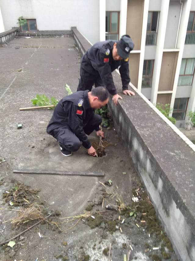 因近日天气变化大,为防止即将到来的夏季暴雨,西华物业管理服务中心的领导安排中心秩序维护队员5名,保洁人员5名,分别对2138cn太阳城集团19栋物业区域及非物业区域楼顶屋面进行全面检查工作,重点对屋面的雨水管是否堵塞进行了排查工作。