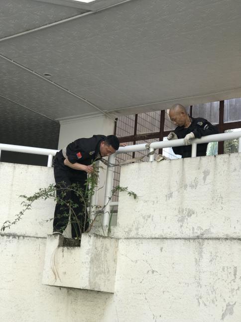 (队员正在对走道花台杂草进行清除工作)